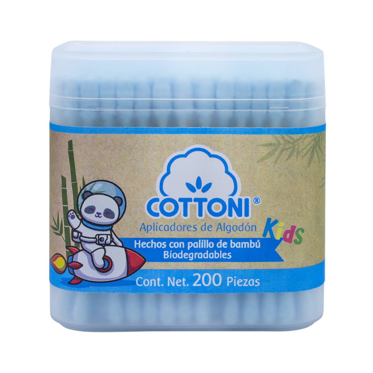 APLICADORES DE ALGODÓN Kids BIODEGRADABLES (Cottoni) Col. Azul Tarro c/200 Pzs.